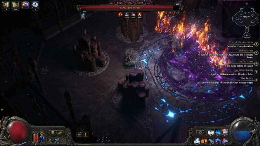 When facing Yama the White, it’s important to understand his attack patterns and elemental resistances. He inflicts chaos damage, making it wise to ensure your chaos resistance is sufficiently high to mitigate incoming harm. Failure to do so could result in taking heavy damage, especially from his more powerful assaults.