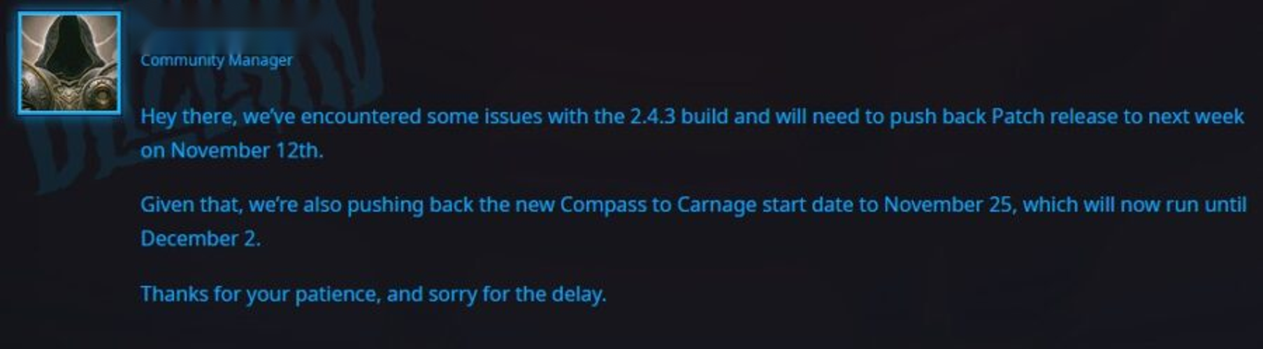 The rollout of Patch 2.4.3 has encountered some unexpected problems, leading to a delay in its release. Instead of launching as scheduled, the update is now set for November 12th. Fans will be pleased to know that the Compass to Carnage event has been extended to accommodate the postponement.