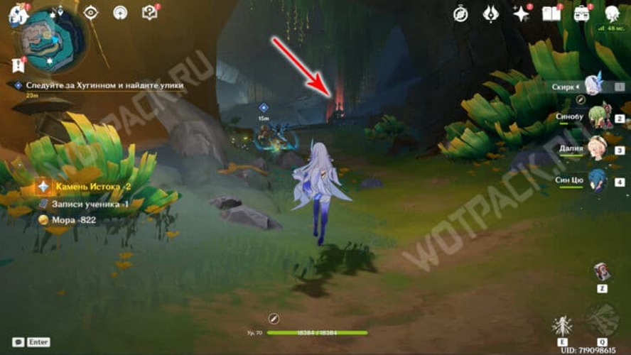 Während deiner Expedition solltest du den Nachtspaziergang des Charakters Luonnotar beobachten, der im Rahmen der Questreihe „Tanz des Schneesturms im grauen Dickicht“ stattfindet. Dabei begleitest du sie durch die frostige Umgebung und gelangst zu den Kammern der Frostmondgöttinnen.