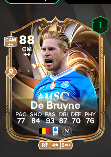 Kevin De Bruyne’s Ratings Reload card stands out as a top-tier Center Midfielder, boasting an impressive overall rating of 88. With remarkable stats such as 93 in passing, 87 in dribbling, and 84 in shooting, this card perfectly encapsulates De Bruyne’s creative and attacking prowess on the pitch. His combination of 77 pace and 76 physicality allows him to transition smoothly between defense and attack, while a solid 70 defense rating ensures he can contribute on both ends. As a central playmaker, De Bruyne’s card provides unparalleled vision and precision, making him the ideal orchestrator to break down defenses, create scoring opportunities, and control the tempo of any match.