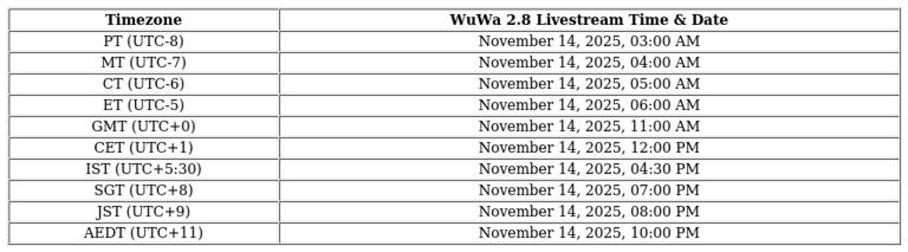 The Wuthering Waves 2.8 live broadcast is set for November 14, 2025, beginning at 6:00 AM Eastern Time (UTC-5).