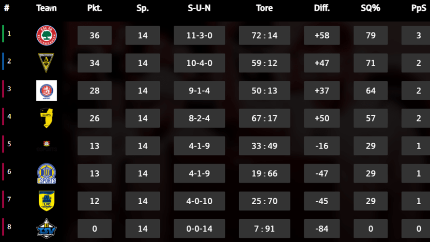 Mit einem Torverhältnis von 33:49 liegt B04 Esports deutlich vor Solingen, das 19:66 aufweist.