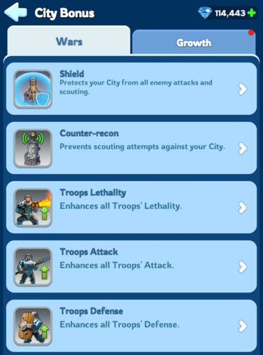 • Counter-Recon: Shields your city from enemy scouting for durations of 2, 8, or 24 hours, keeping your plans hidden.