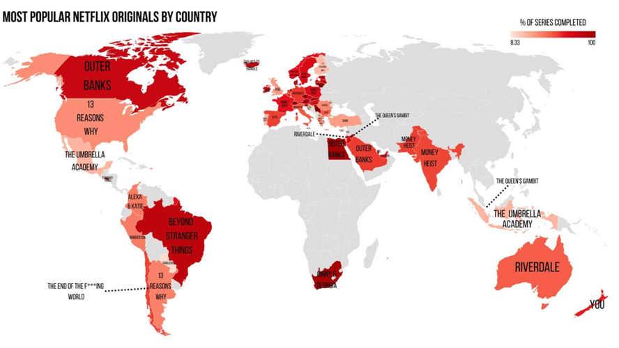 Our data reveals varying levels of engagement across countries. Lithuanians, South Africans, Egyptians, Salvadorans, and Serbians stand out as the most dedicated fans of Netflix Originals. Lithuanians and South Africans have completed entire seasons of Ginny & Georgia. Egyptians have binge-watched Outer Banks from start to finish, while Serbians are captivated by The Queen’s Gambit. Notably, Salvadorans take top honors by finishing Stranger Things, a series comprising 25 episodes totaling approximately 21.5 hours.